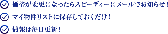 マイ物件リストに気になる物件を保存しておくだけで、その物件の価格が変更になった際に自動メールで即お知らせを致します。 物件情報の更新は毎日行なっているので、値下り情報を即入手出来ます。